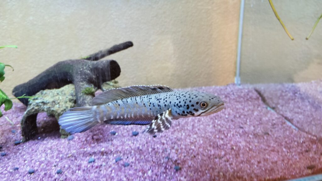 体側・鰭の派手な斑紋と小型性は本種の特徴ですが、近縁の小型スネークヘッドも多く、採集地の“谷筋の小渓流相”に適応するレイアウトなら、いずれにせよ外しにくい様子です。